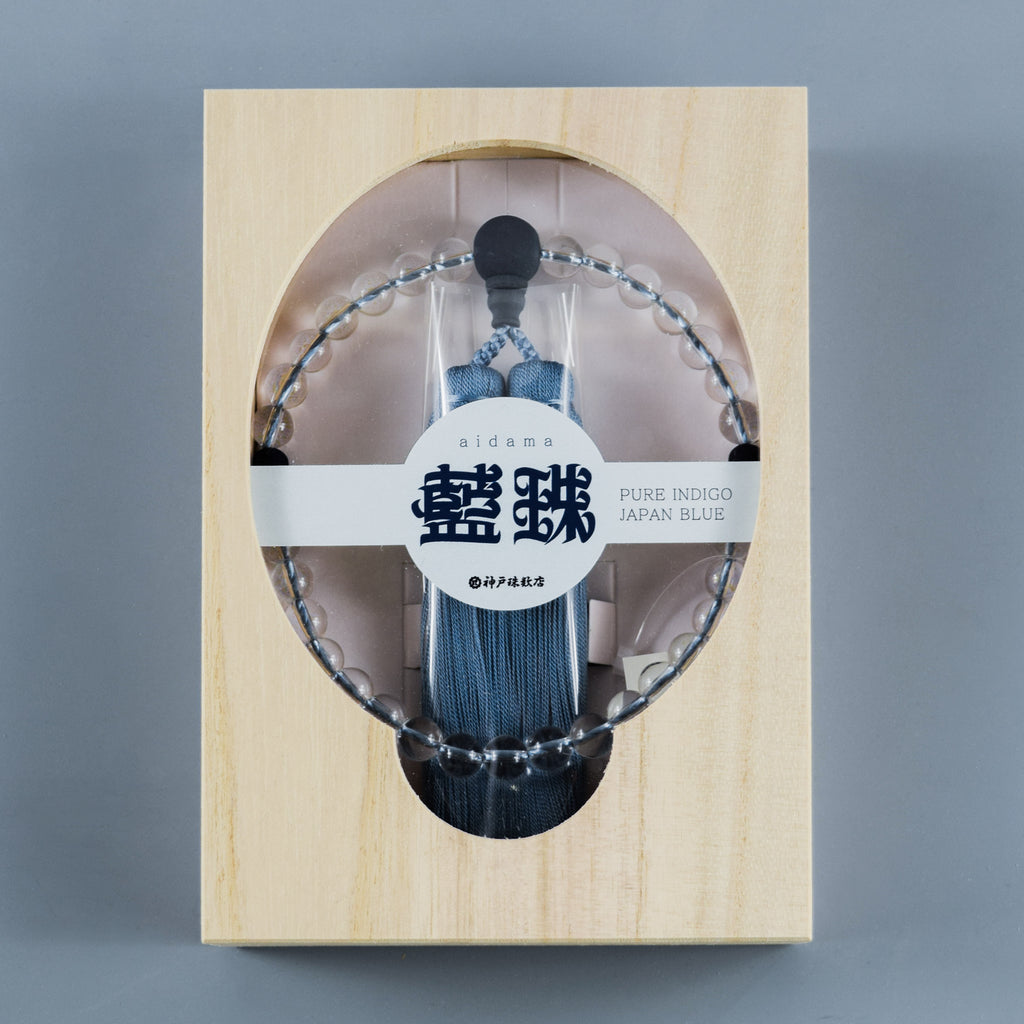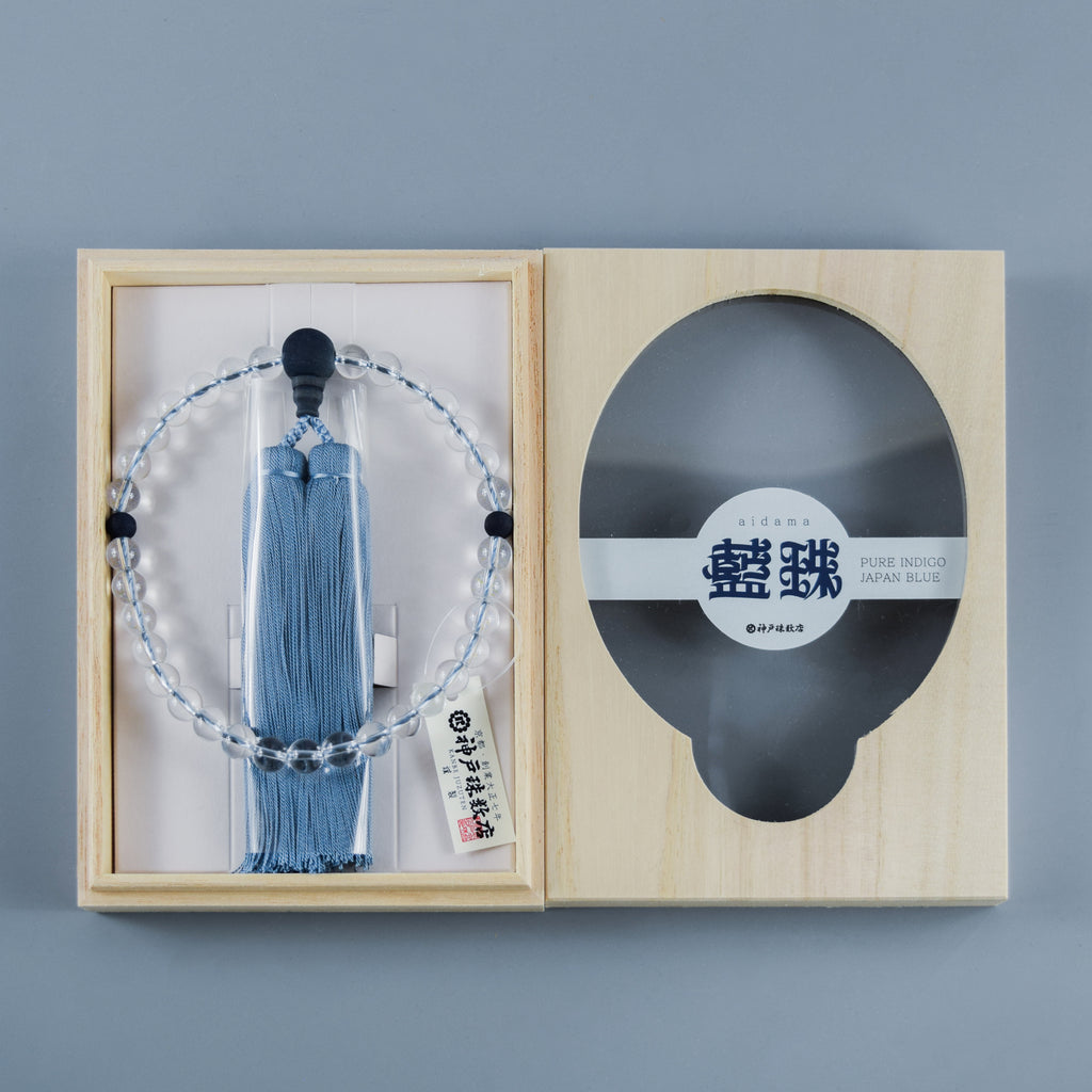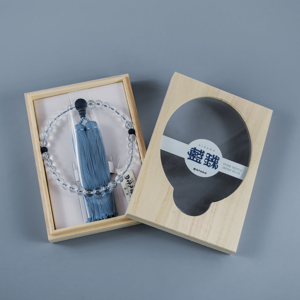 The main beads of this rosary are made of white crystal, accented with Japanese indigo-dyed wooden beads.