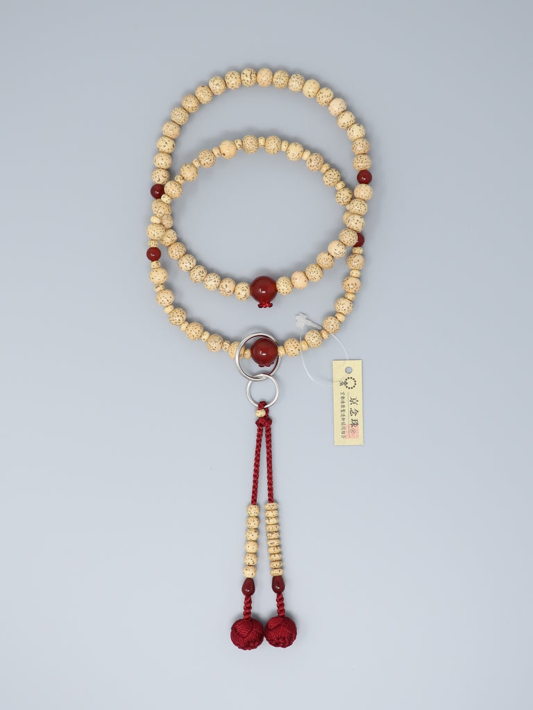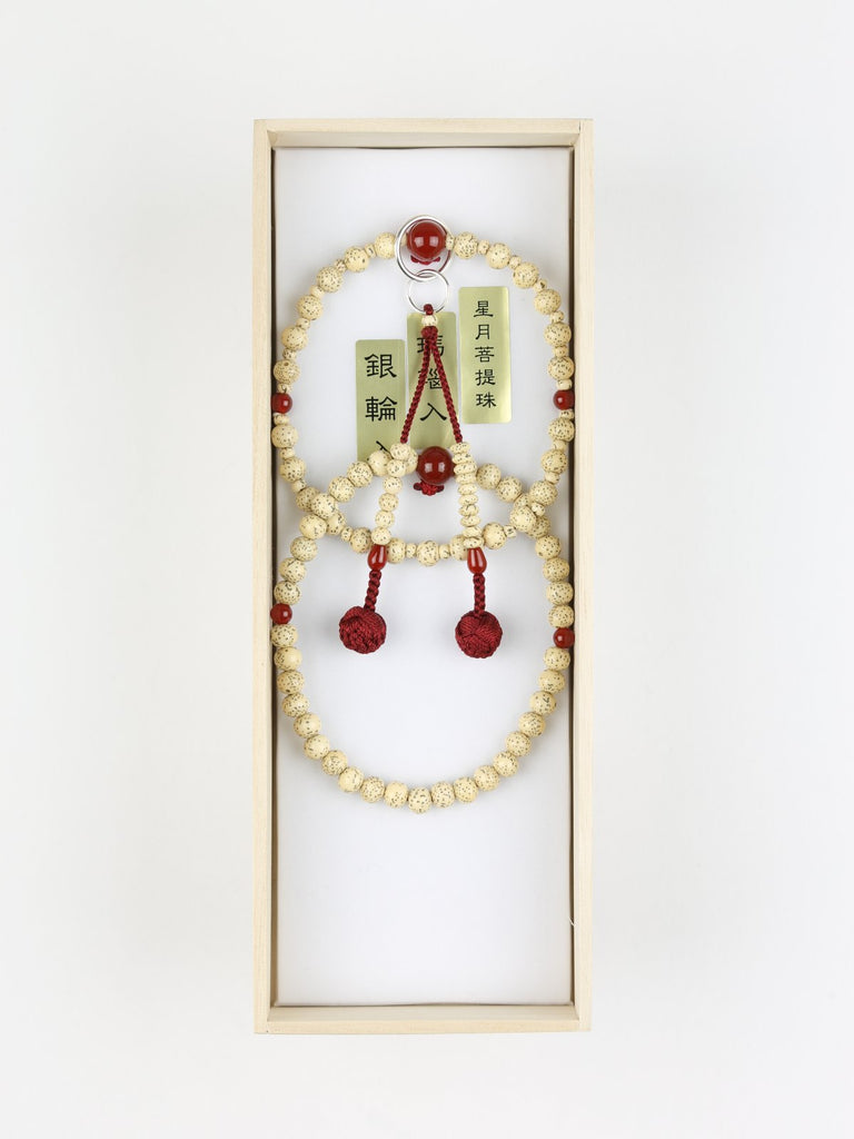 二重の輪に房が付いた独特の構造が特徴で、衆生のつながりを象徴します。菩提樹や瑪瑙などの素材が使われ、簡素さと信仰心を表しています。